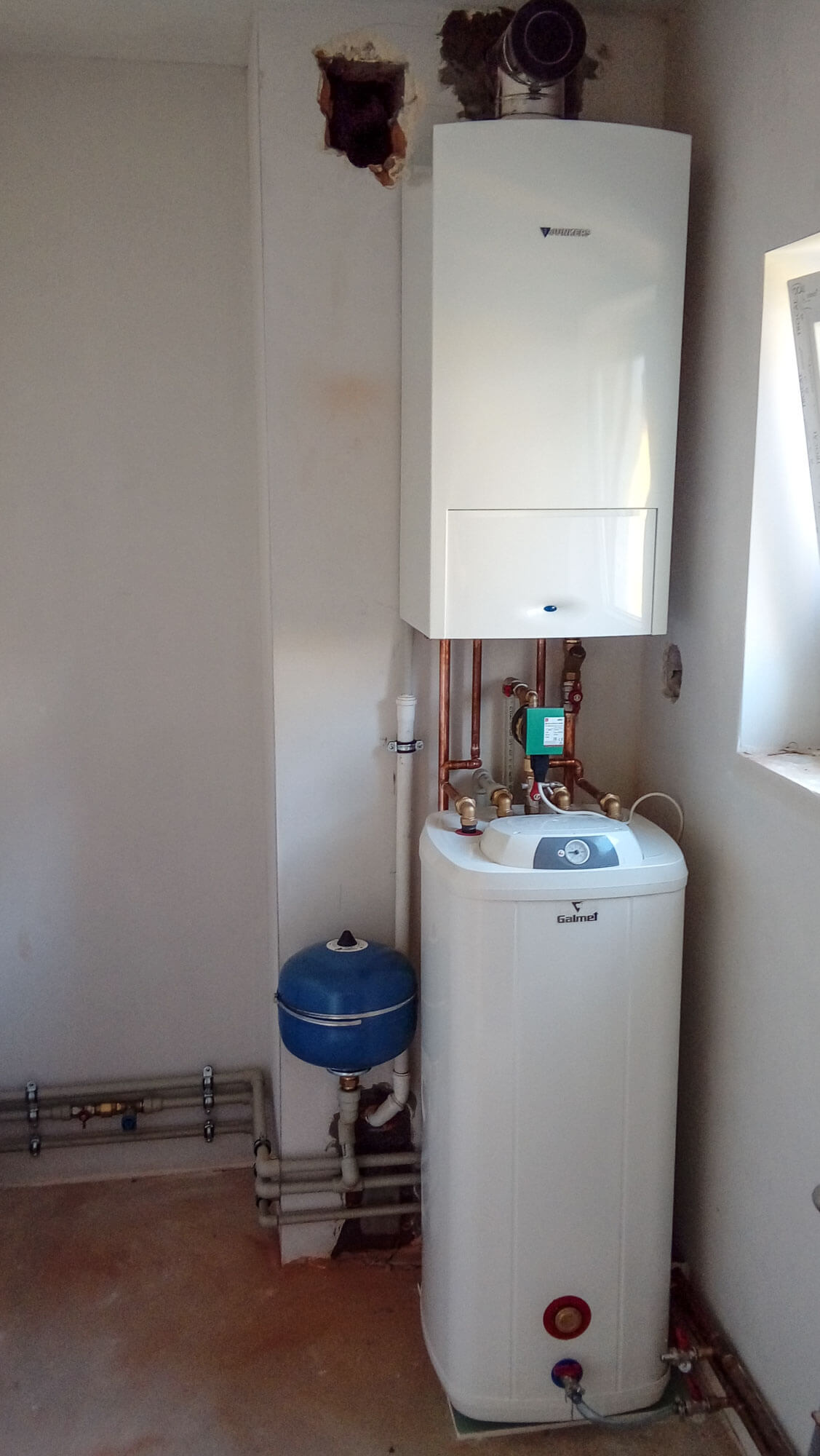 W Budynku gospodarczym na tej samej działce, również zamontowaliśmy kocioł gazowy, kondensacyjny sprawdzonej marki – Junkers oraz zasobnik do ciepłej wody użytkowej firmy Galmet 100l, a także grzejniki kompaktowe, wyposażone w zawory i głowice termostatyczne. Na przyłączu wody, w budynku zamontowane zostały filtry wstępne z wkładami sznurkowymi.