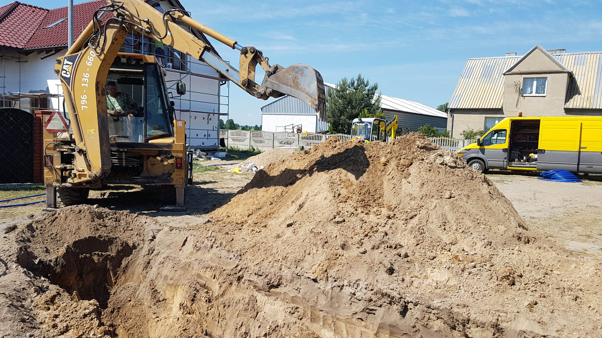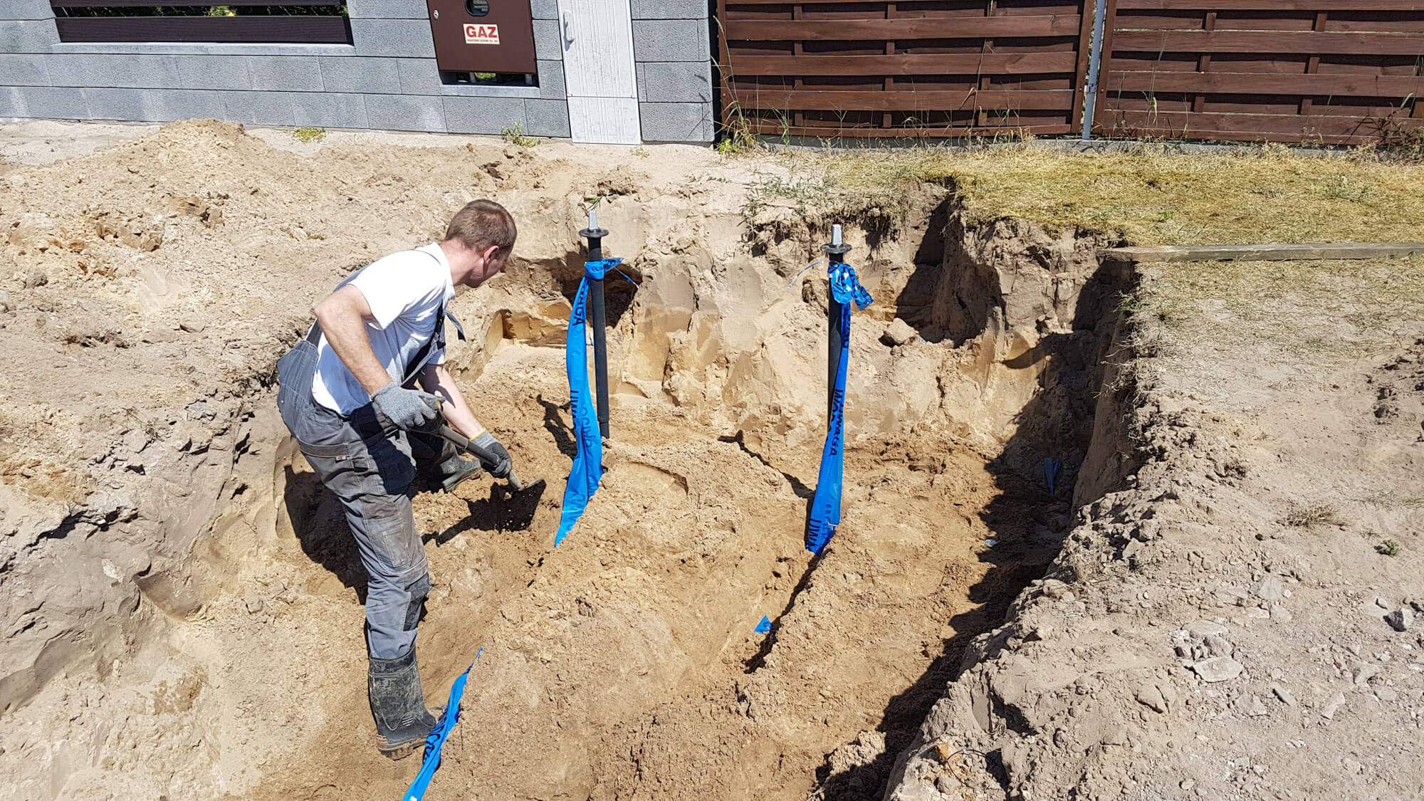 W ramach prac przy tej inwestycji wykonaliśmy przyłącza wodociągowe – jedno przyłącze do budynku głównego a drugie przyłącze do budynku gospodarczego, znajdującego się na tej samej działce oraz przyłącza kanalizacyjne też do obu budynków. Wykonaliśmy wewnętrzną instalację gazową także do obu budynków.Załatwiliśmy również wszystkie formalności ,dzięki czemu Klient nie musiał się denerwować i biegać po urzędach.