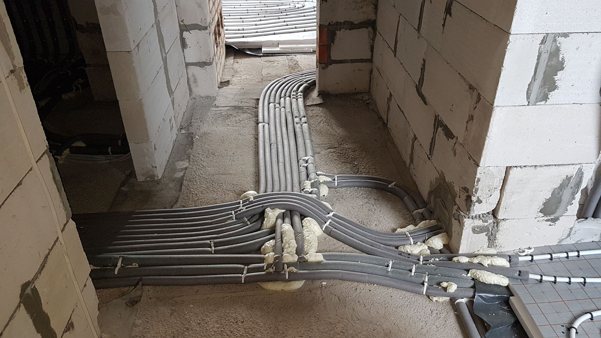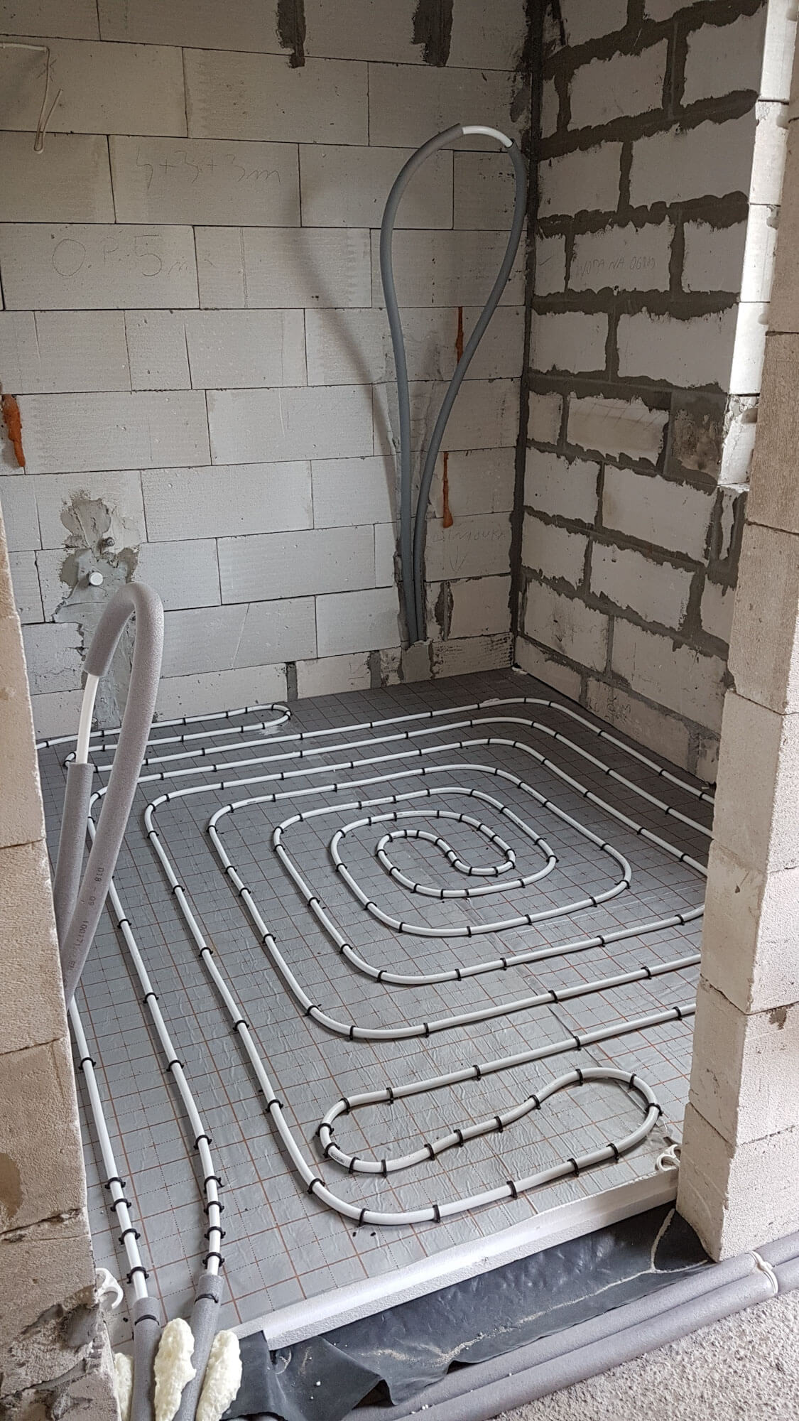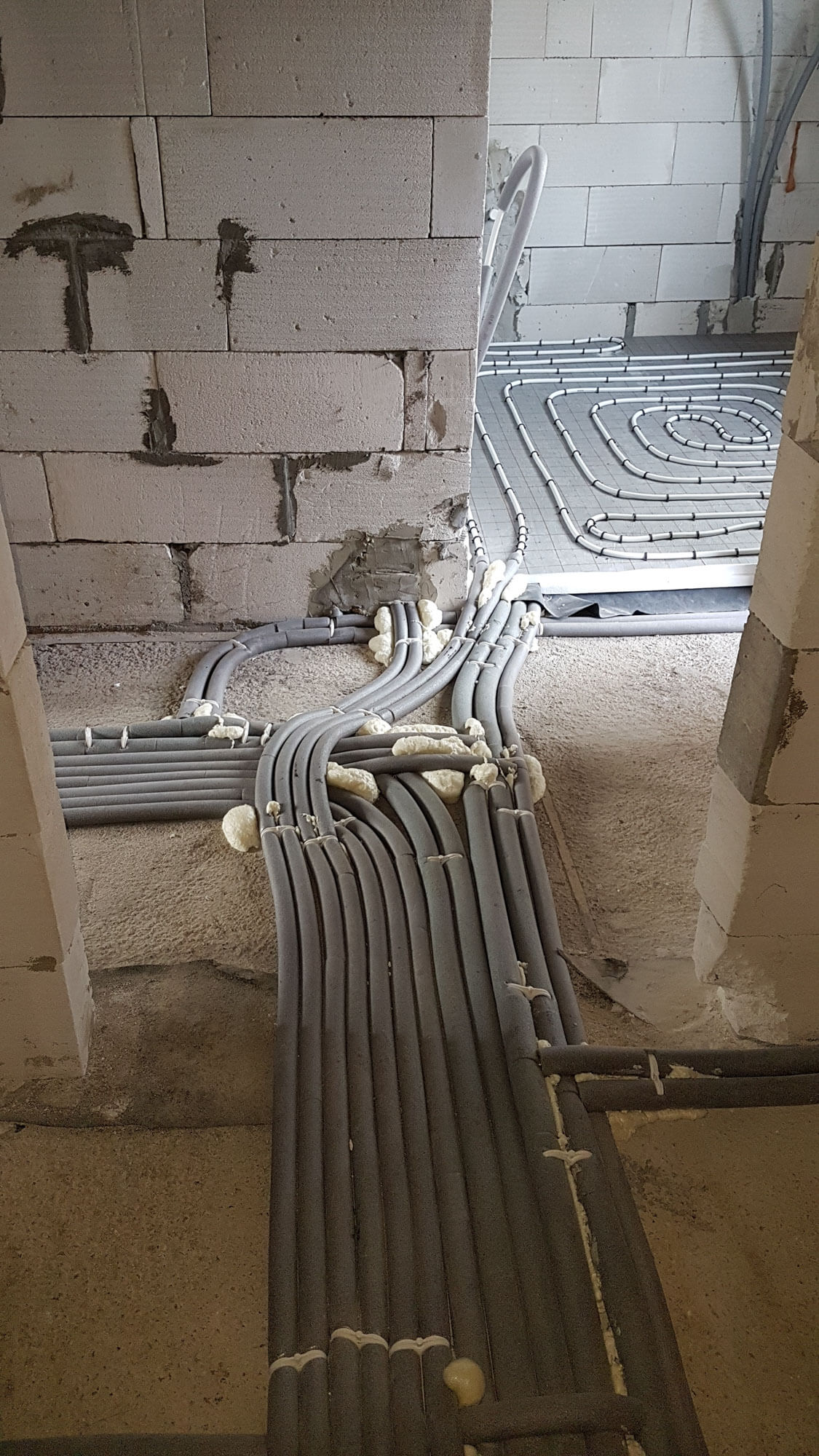 Ogrzewanie podłogowe wykonane zostało z rury wielowarstwowej Alu Pex firmy Wavin ułożone na macie styropianowej o podwyższonej klasie z warstwą refleksyjną firmy Kotar. Zastosowaliśmy rozdzielacz do ogrzewania podłogowego firmy Tece.