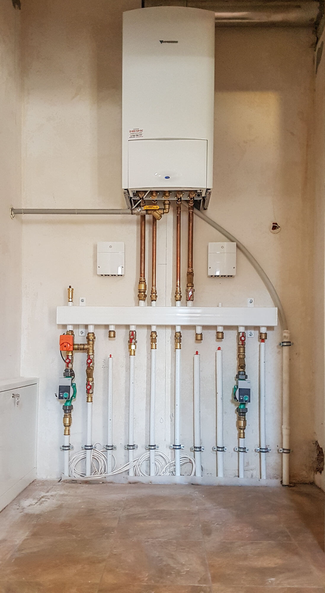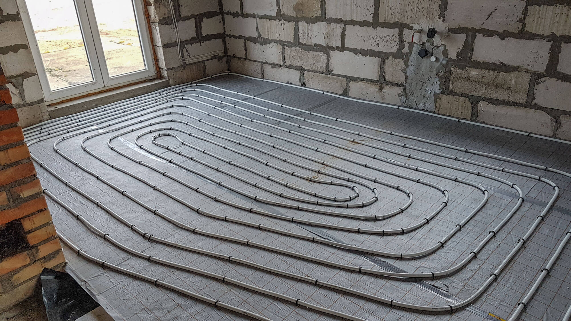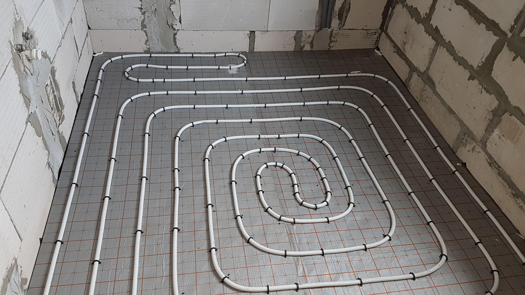 Ogrzewanie podłogowe wykonane zostało z rury wielowarstwowej Alu Pex firmy Wavin ułożone na macie styropianowej o podwyższonej klasie z warstwą refleksyjną firmy Kotar. Zastosowaliśmy rozdzielacz do ogrzewania podłogowego firmy Tece.