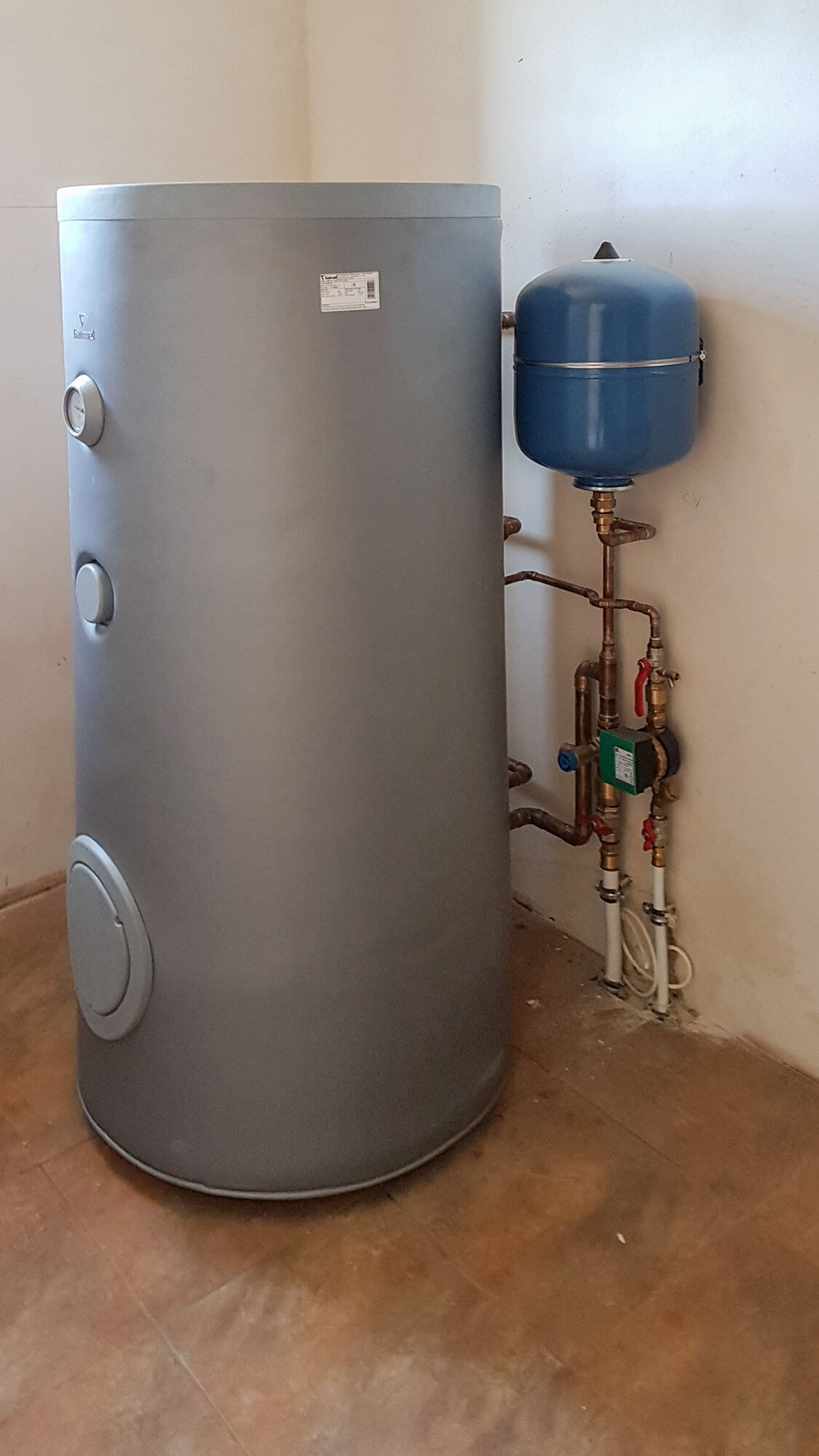 Przygotowanie ciepłej wody odbywa się poprzez zasobnik firmy Galmet o pojemności 250 L z wbudowaną wężownicą spiralną. Zasobnik jest zasilany z kotła gazowego. Na obwodzie ogrzewania podłogowego, zainstalowany został 3-drogowy zawór mieszający z napędem, którym steruje programator firmy Junkers model fw120, wyposażony w funkcję sterowania pogodowego. Do kotła podłączony jest czujnik pogodowy zamontowany na zewnątrz budynku, dzięki czemu użytkownik nie musi regulować temperaturą kotła, ponieważ odbywa się to automatycznie.